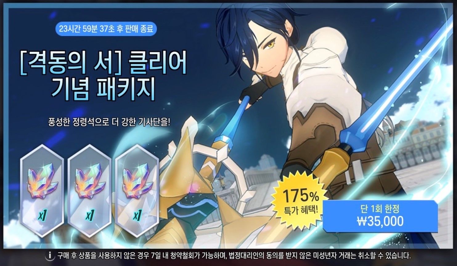 ※ 격동의 서 클리어 기념 패키지 구매 시 [미지의 정령석] 3개를 획득할 수 있습니다.