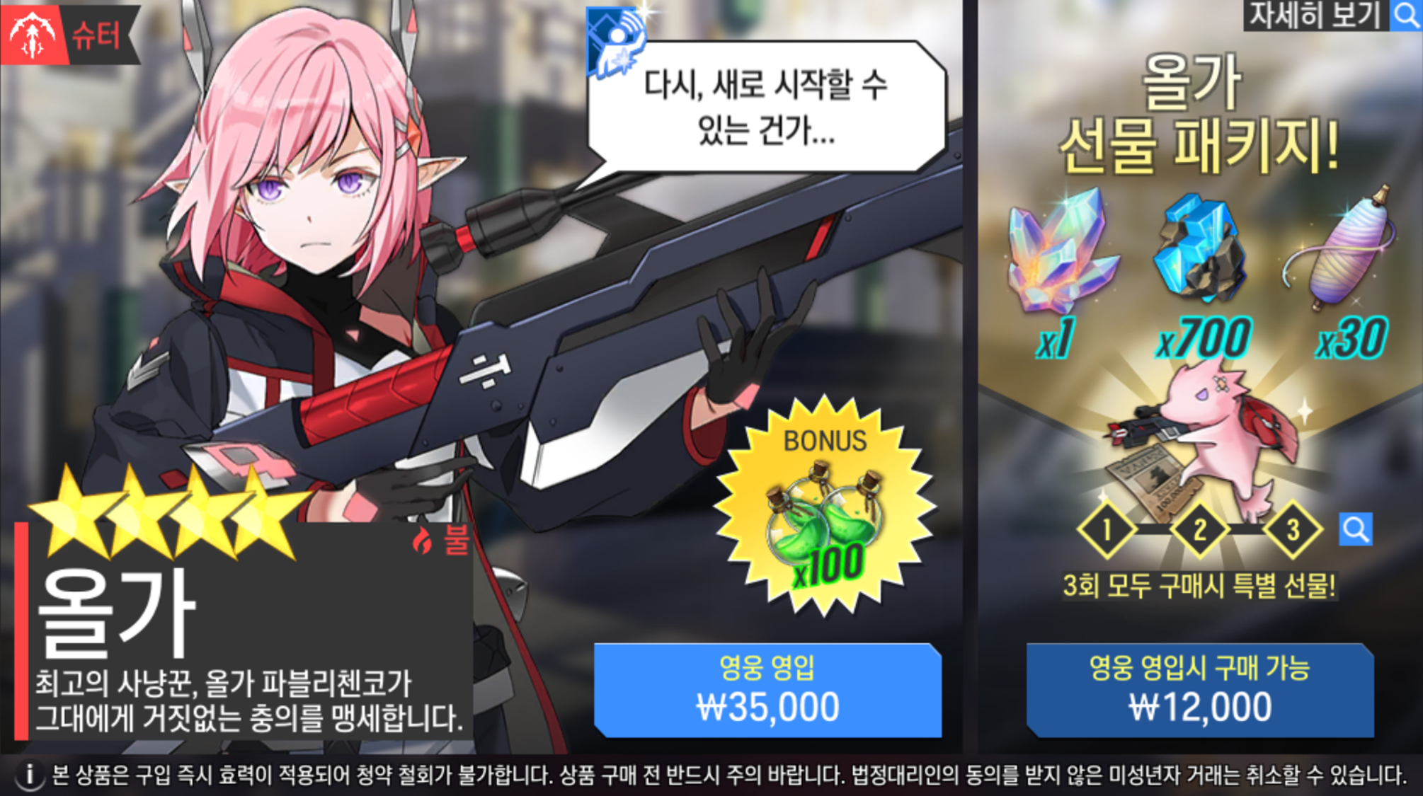 - [불] 올가는 신규 영웅 패키지 구매로 영입이 가능합니다.