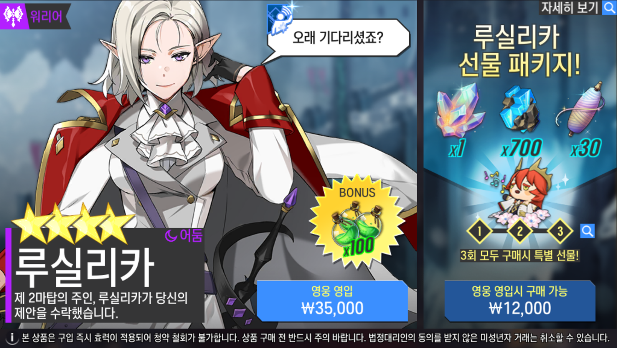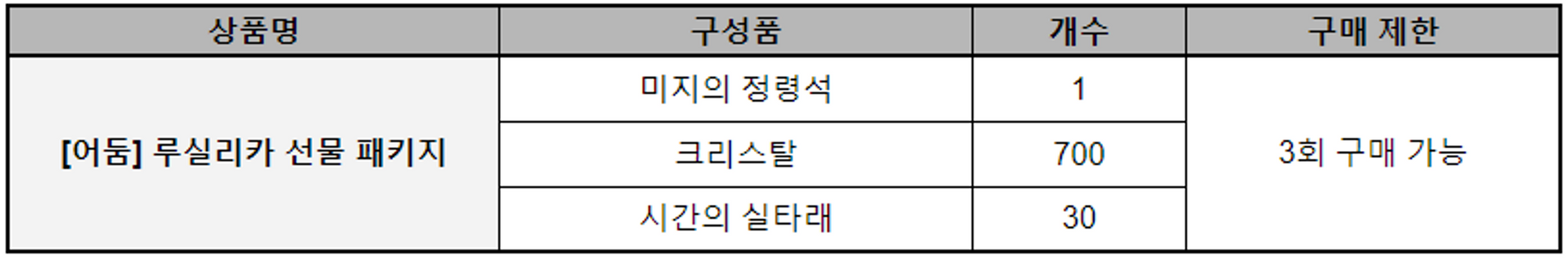 - 영웅 패키지 [어둠] 루실리카 영입 후 구매할 수 있는 상품입니다.