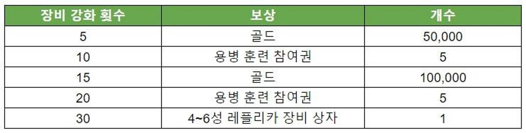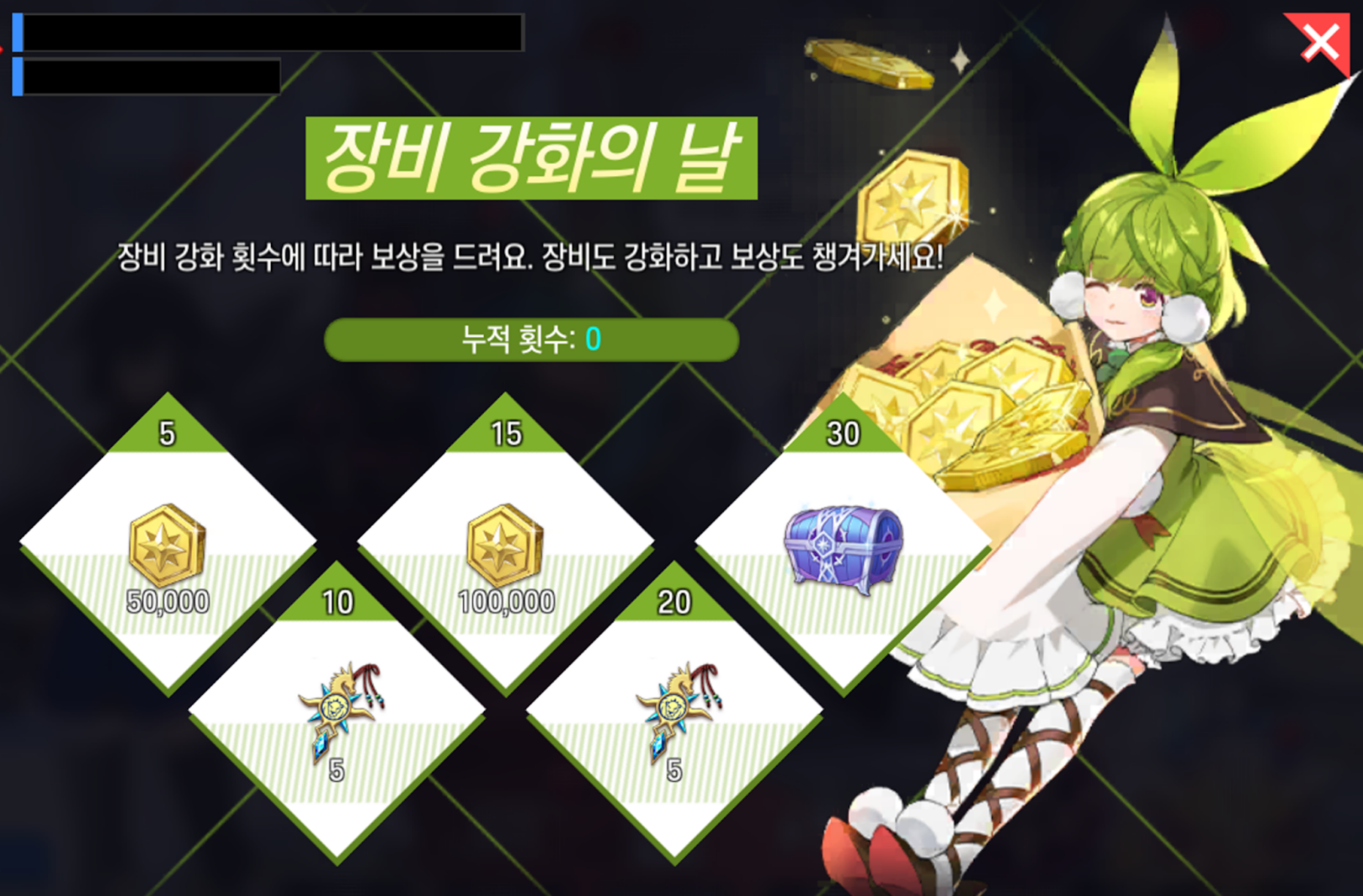 - 매일 장비 강화 횟수에 따라 보상을 드립니다! 장비도 강화하고 보상도 챙겨가세요!