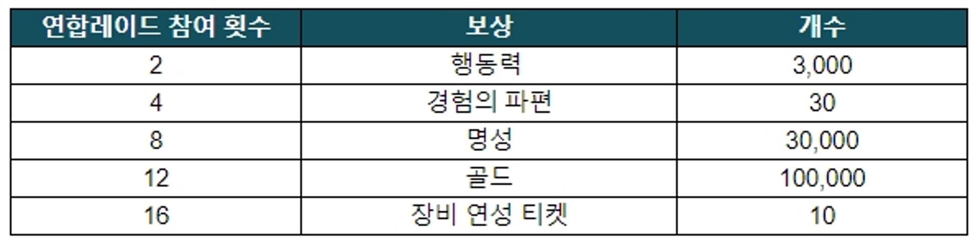 - 이벤트 기간 동안 연합 레이드 진행 횟수에 따라 보상을 드립니다!