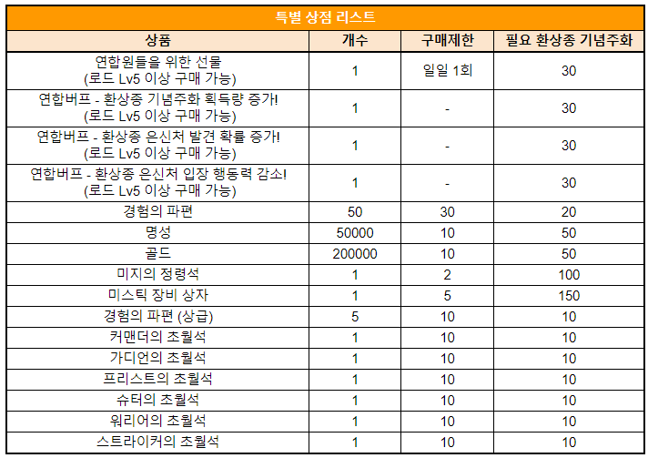 ※ 특별 상점에서 판매 중인 연합 버프 및 연합원을 위한 선물은 로드 레벨5 이상 부터 구매할 수 있습니다.