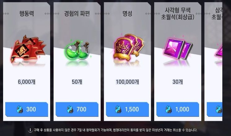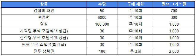 ※ 만물 상점의 구매 제한은 매주 일요일 12:00(로컬) 초기화 됩니다.