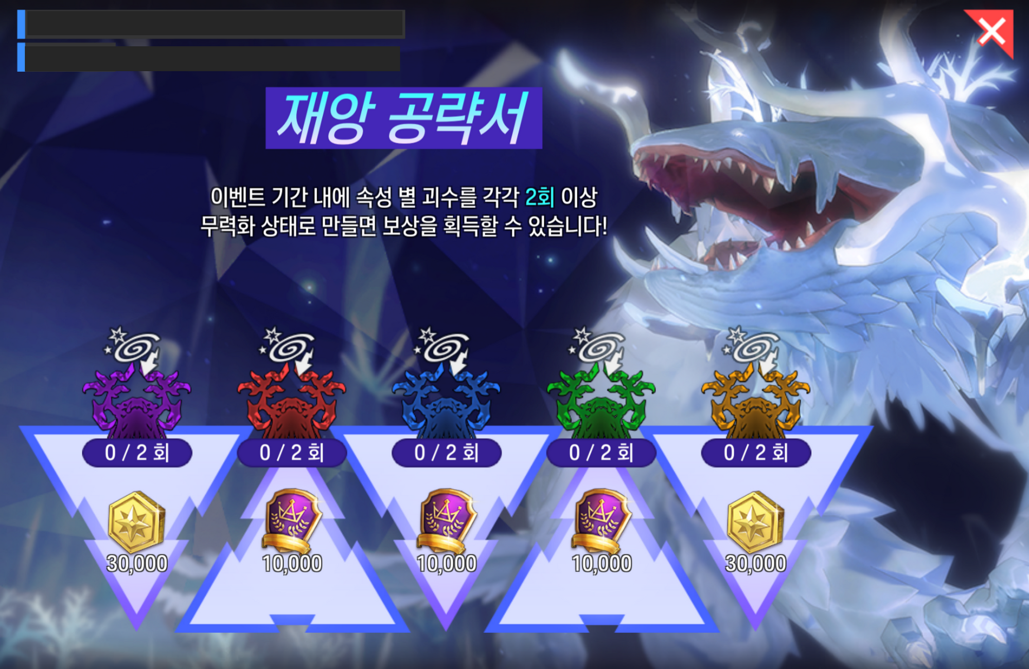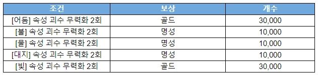 - 이벤트 기간 동안 속성 별 괴수를 각각 2회 이상 무력화 상태로 만들고 보상을 획득하세요!