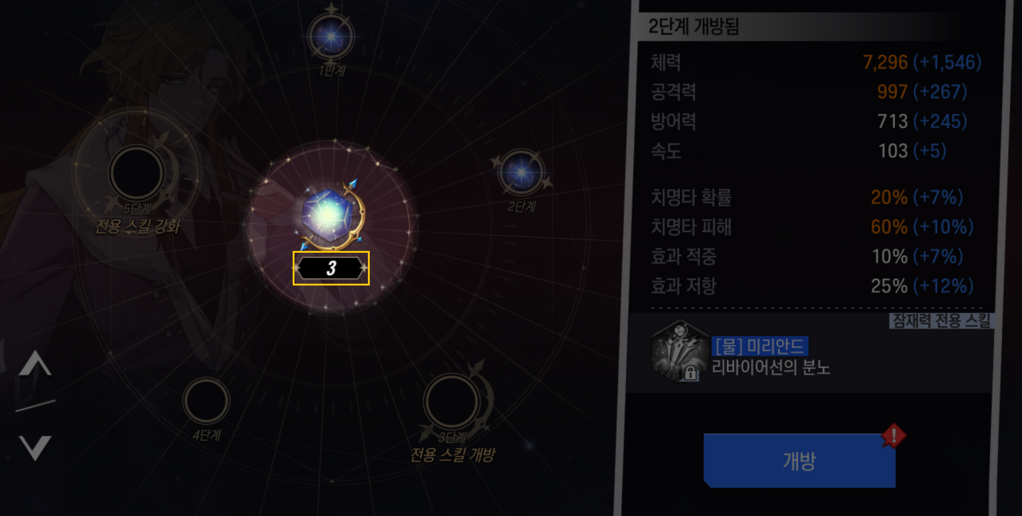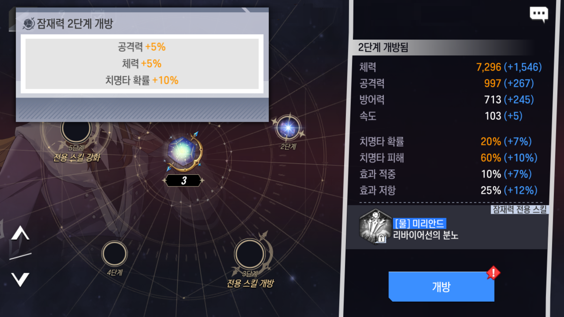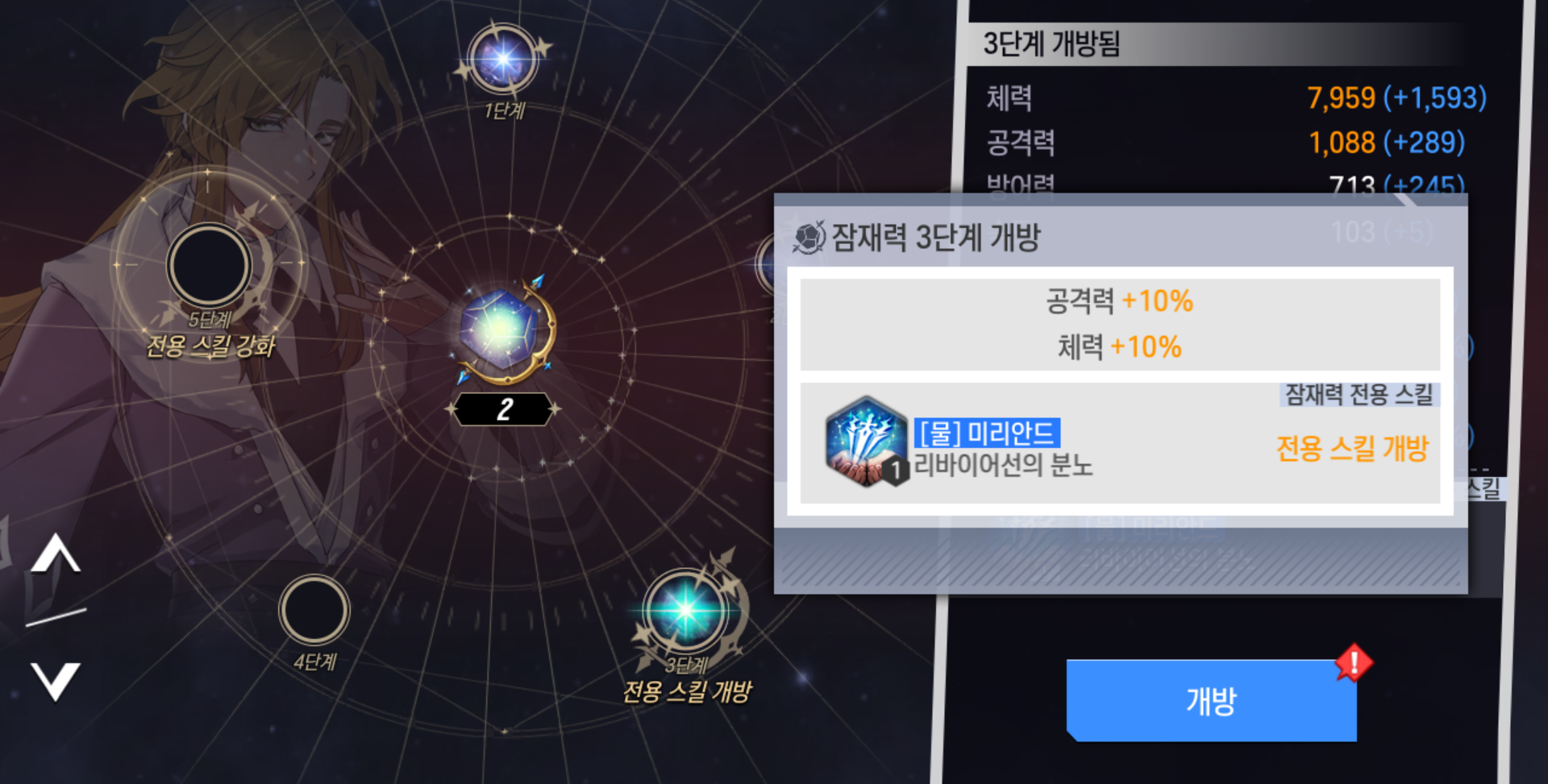 - 잠재력 개방 단계(3단계, 5단계)에 따라 영웅의 잠재력 스킬 획득 및 레벨을 올릴 수 있습니다.
