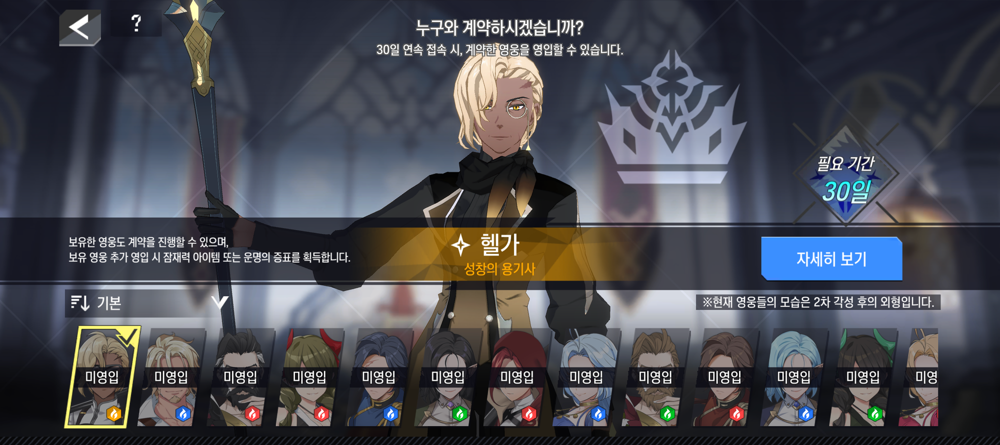 - 목록의 영웅 중 한명을 선택하여 계약을 맺을 수 있으며, 계약은 30일간 진행됩니다.