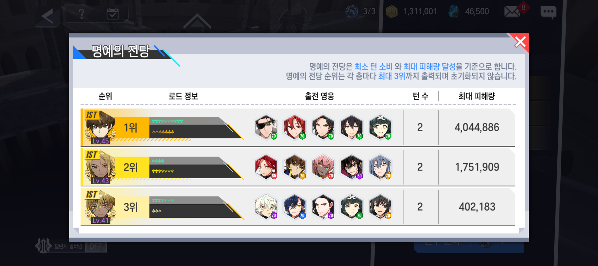 - 명예의 전당 랭킹 순위 조건은 골드 챌린지 달성 기준, ‘최소 턴 소비’, ’최대 피해량 - 달성’이며 최대 3위까지 기록됩니다.