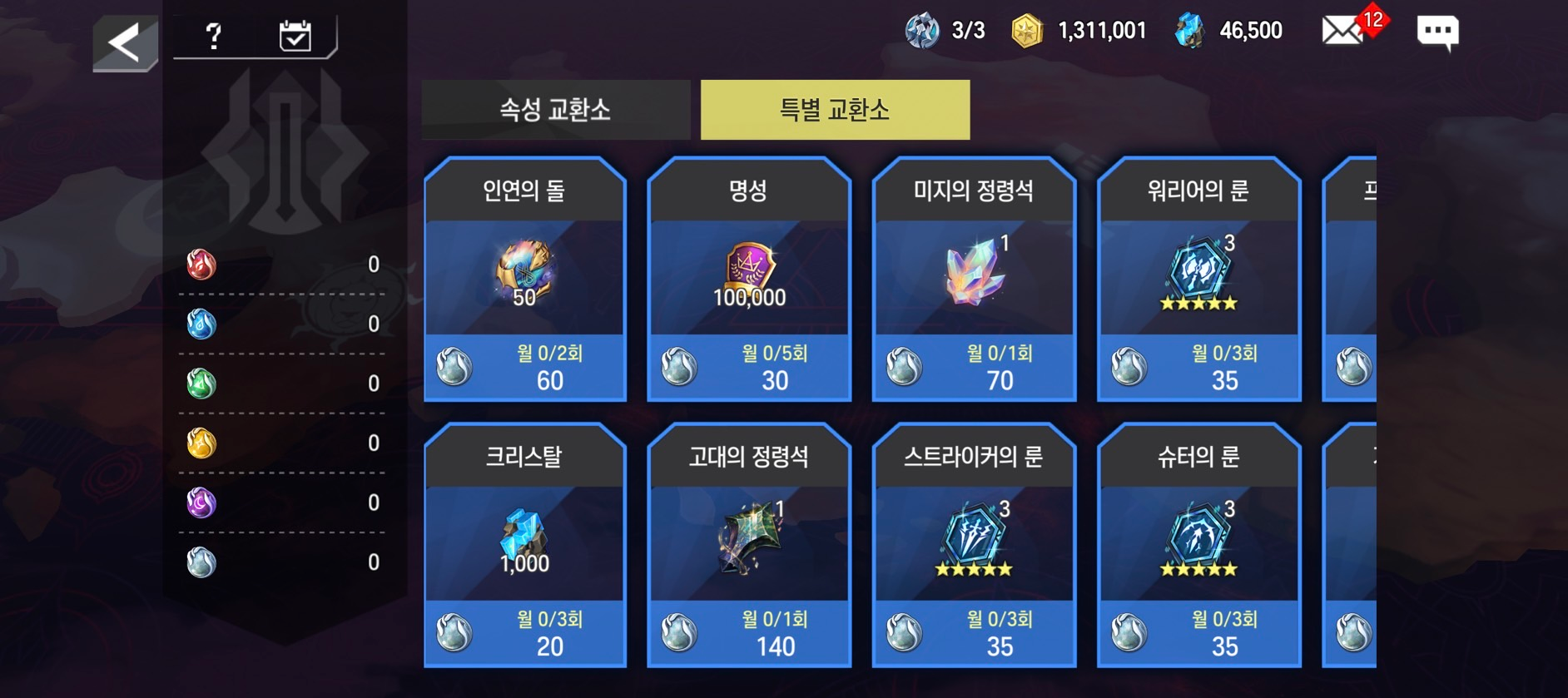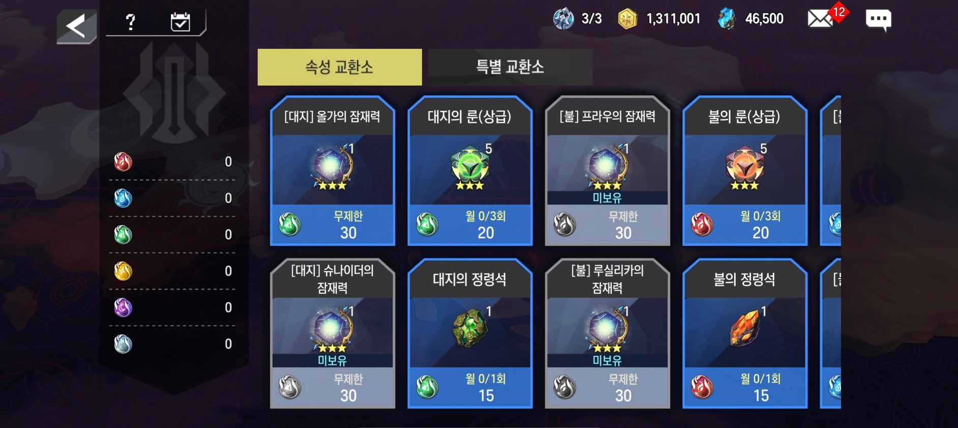 - [원소 상점] 내 [속성 교환소]/[특별 교환소]가 존재하며 [속성 교환소]는 속성별 원소를 사용하여 재화를 교환할 수 있으며 [특별 교환소]는 무형의 원소를 사용하여 재화를 교환할 수 있습니다.