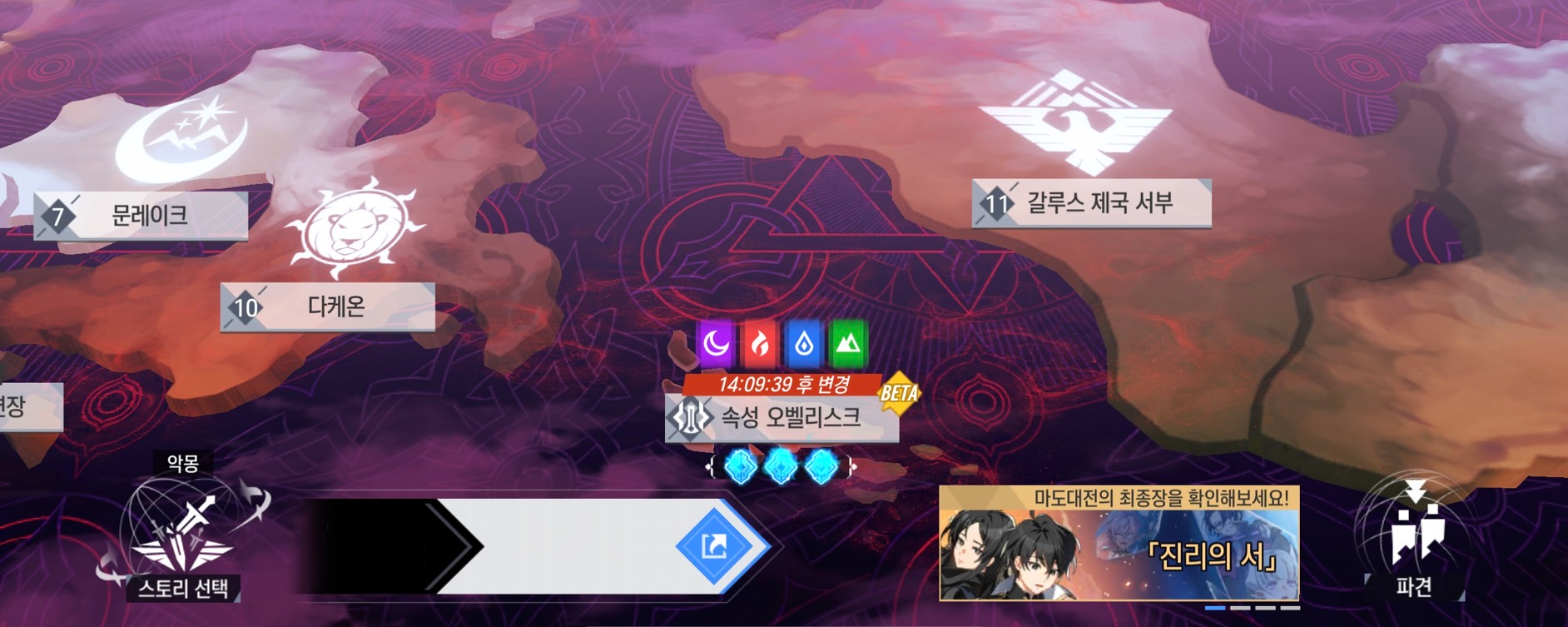 - [왕성]>[스토리]>[월드맵 > 속성 오벨리스크]를 통해 해당 콘텐츠로 진입할 수 있습니다.