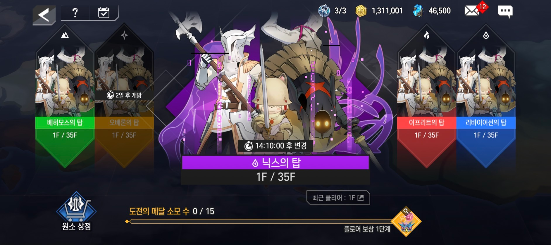 - [도전의 메달]은 전투에서 클리어 시 소모되는 형태이며, 소모한 수에 따라 [플로어 보상]을 획득할 수 있습니다.