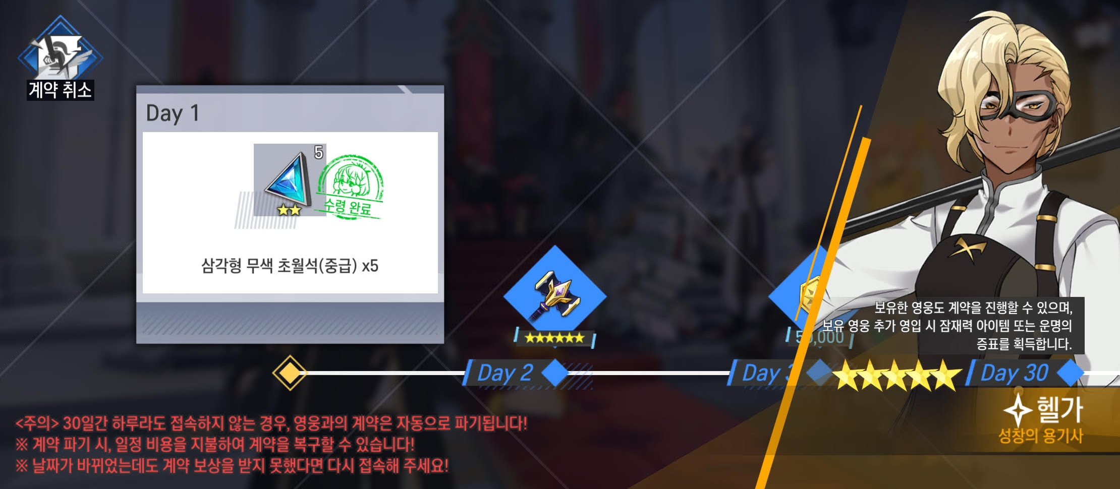 - 매일 접속을 하지 못한 경우, 영웅의 계약이 파기되며 계약이 파기되면 영웅 선택 상태로 돌아갑니다.