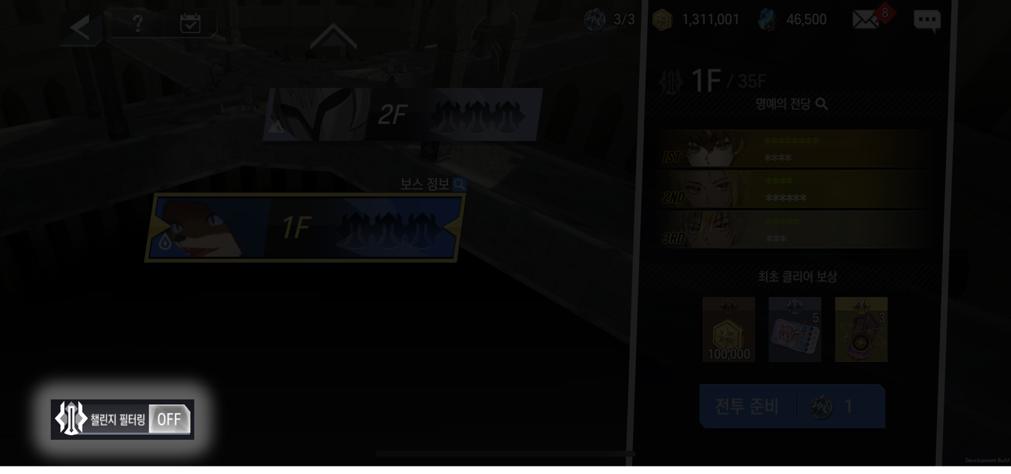 - [챌린지 필터링]은 ON/OFF를 통해 조정 가능하며 ON 상태의 경우, 금메달을 획득하지 못한 층과 다음 클리어할 층을 노출시킵니다. OFF 한 경우엔 메달 조건과 관계없이 모든 층을 출력합니다.
