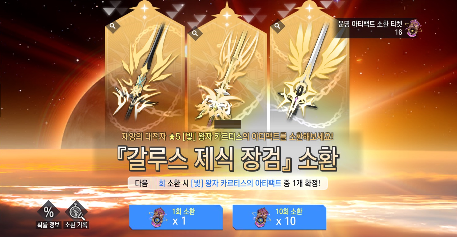 ※ 게임 내 소환 페이지에 있는 [확률 정보] 버튼을 통해 상세 확률 정보 및 소환으로 획득 가능한 아티팩트 목록을 확인할 수 있습니다.