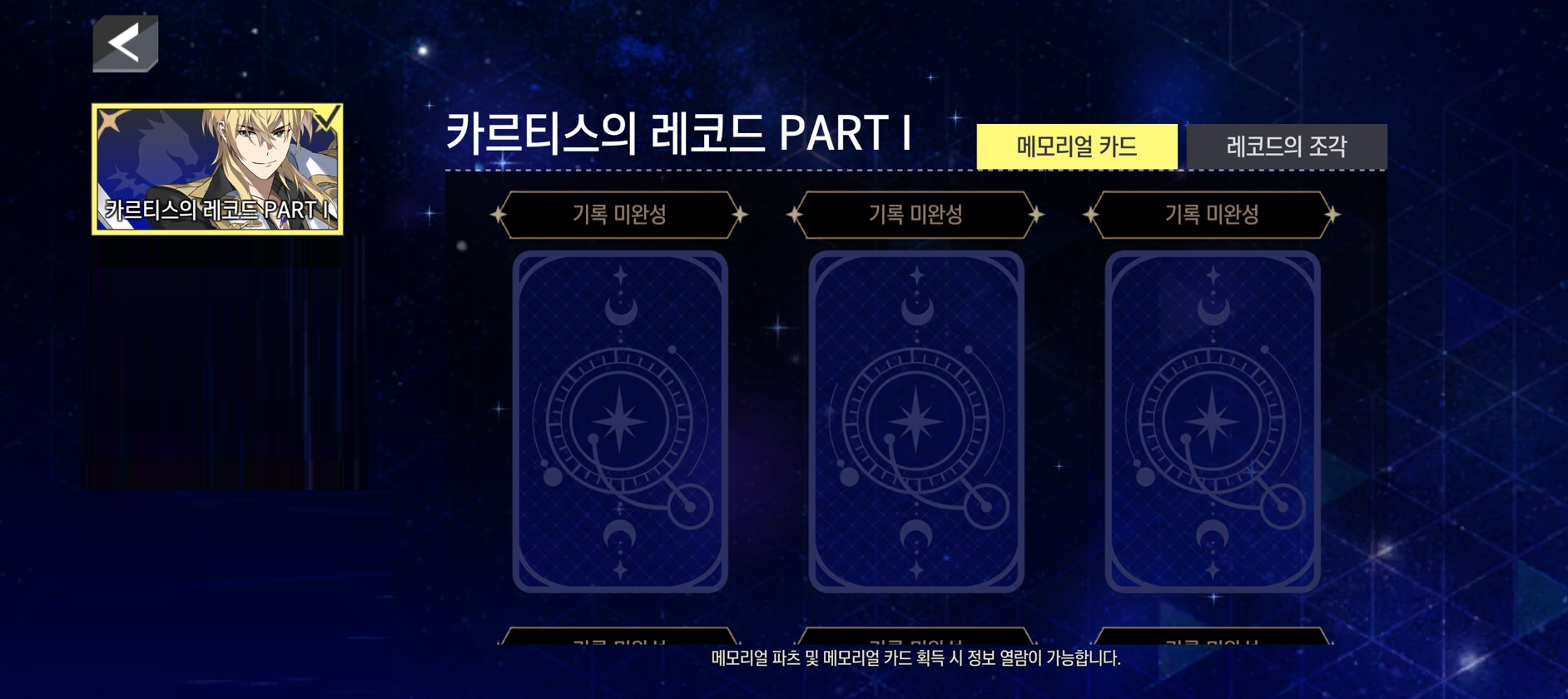 - 레코드 갤러리의 메모리얼 카드 정보는 [메모리얼 파츠] 및 [메모리얼 카드] 를 모두 획득 시 완성됩니다.