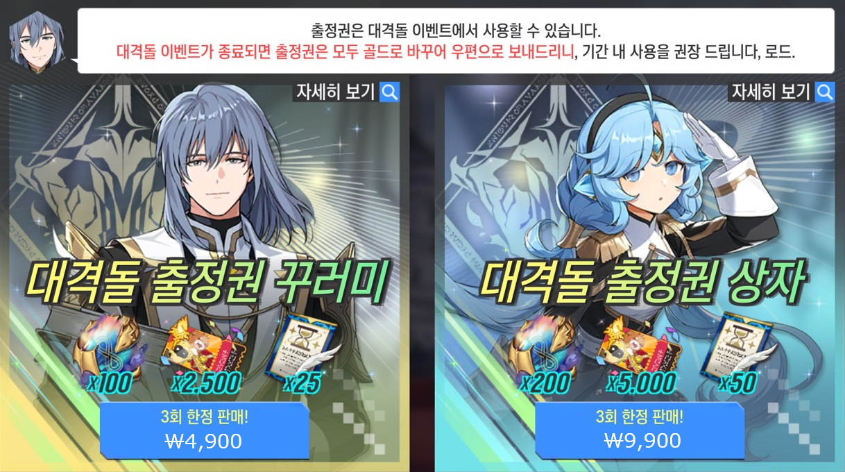 ※ [출정권]은 대격돌! 기사단 이벤트에서 사용할 수 있으며 이벤트가 종료되면 [출정권]은 모두 골드로 변경되며, 우편을 통해 지급됩니다.