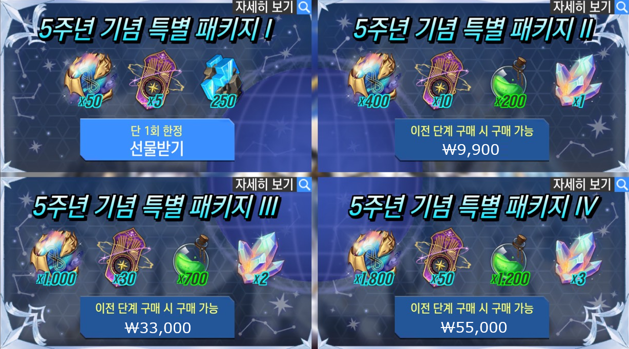 ※ 특별 선물 패키지는 총 3단계로 이루어져 있으며, 이전 단계 패키지를 구매하면 다음 단계 패키지가 노출됩니다. (예 : 2단계 구매 → 3단계 구매 가능)