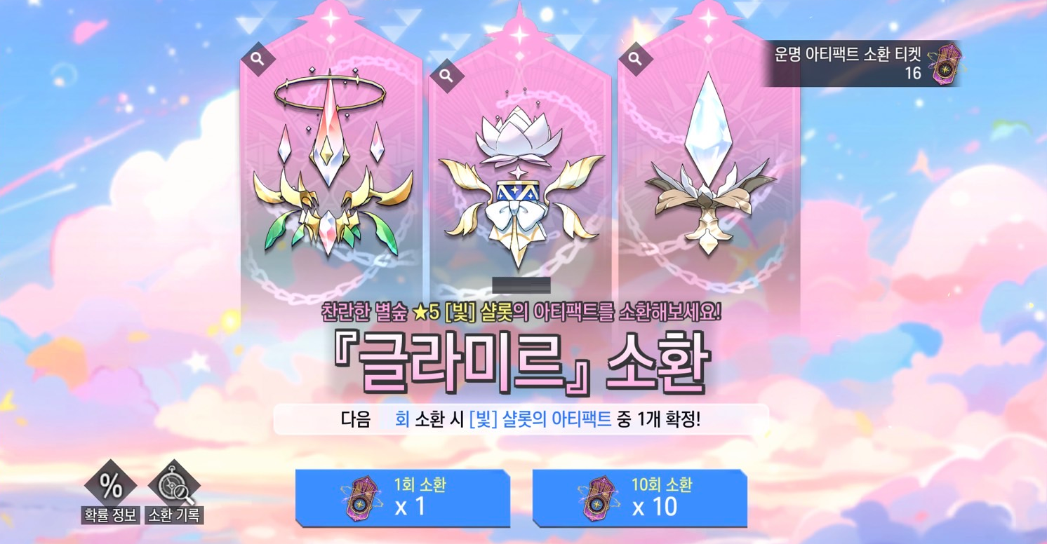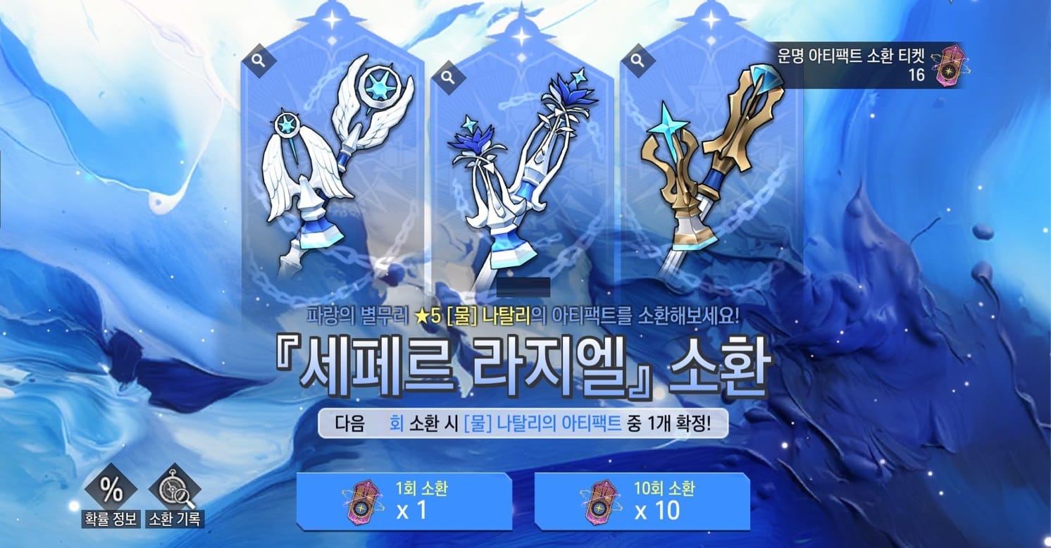 ※ 게임 내 소환 페이지에 있는 [확률 정보] 버튼을 통해 상세 확률 정보 및 소환으로 획득 가능한 아티팩트 목록을 확인할 수 있습니다.