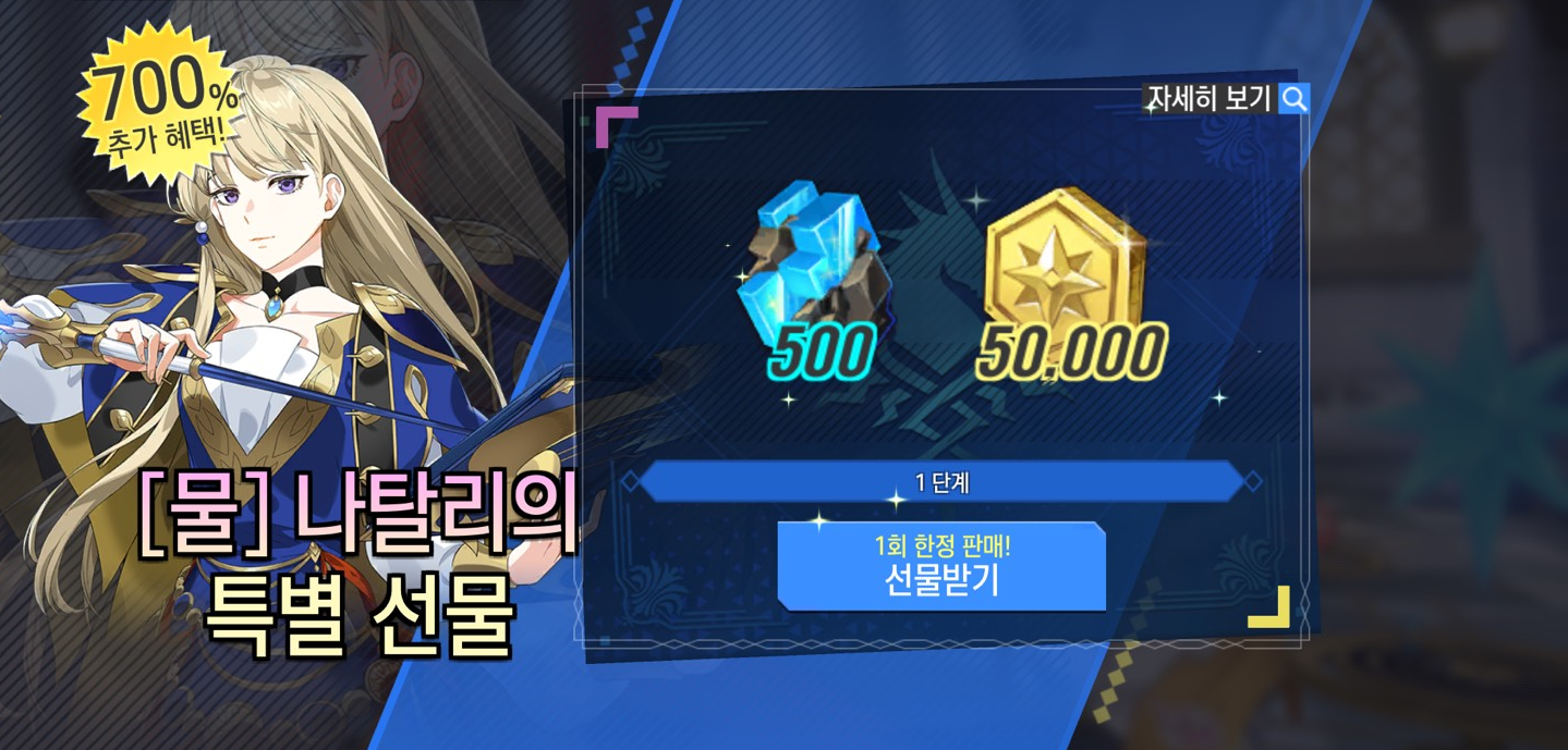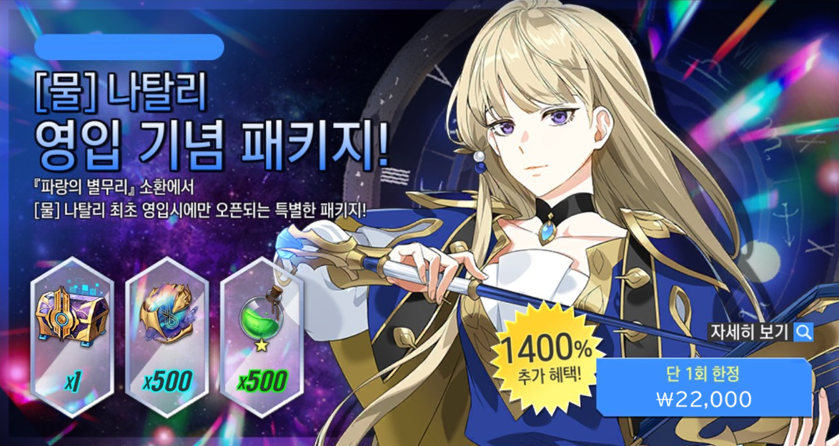 ※ [파랑의 별무리] 소환에서 영웅 [물] 나탈리를 패키지 판매 기간 중 1회 영입 후 구매할 수 있는 패키지입니다.