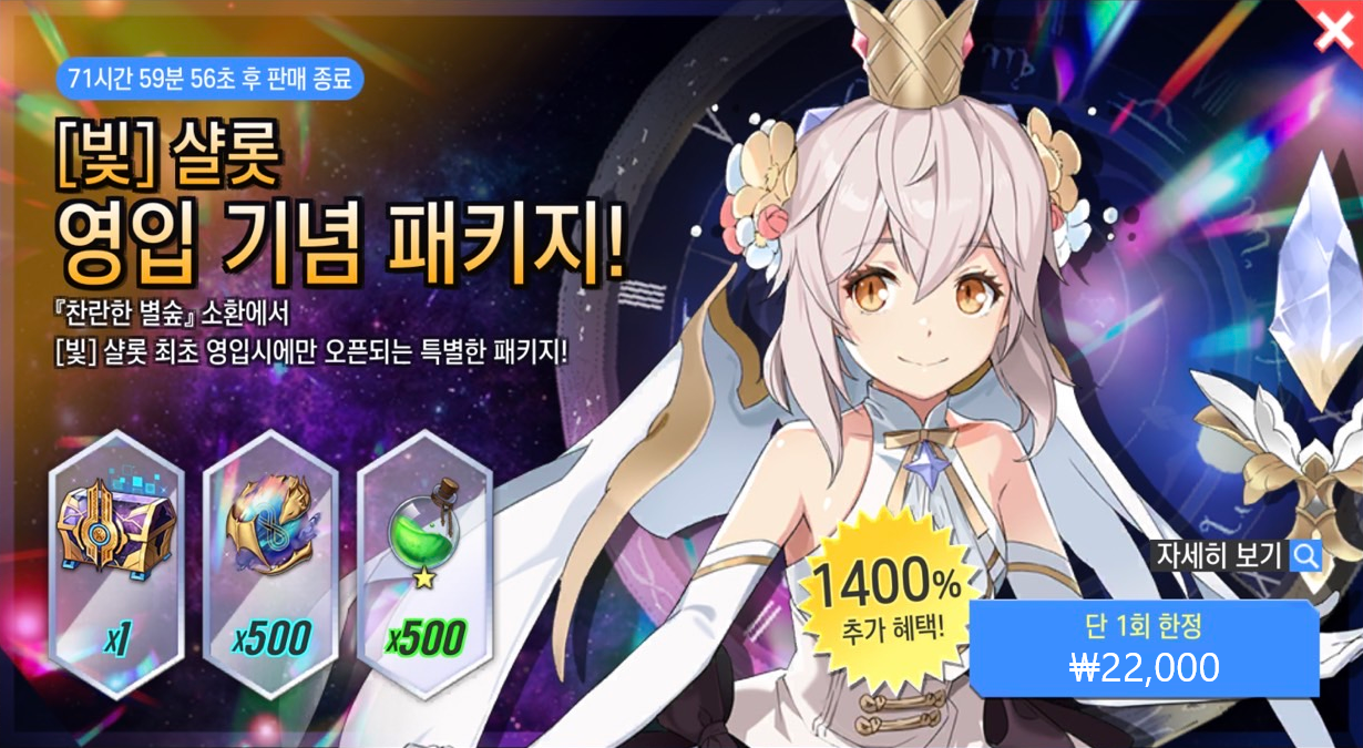 ※ [찬란한 별숲] 소환에서 영웅 [빛] 샬롯을 패키지 판매 기간 중 최초 1회 영입 후 구매할 수 있는 패키지입니다.