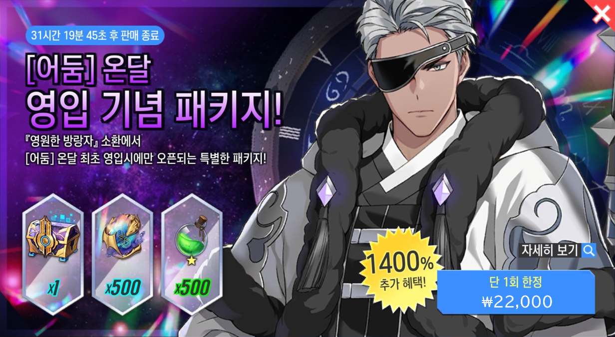 ※ [영원한 방랑자] 소환에서 신규 영웅 [어둠] 온달을 패키지 판매 기간 중 최초 1회 영입 후 구매할 수 있는 패키지입니다.