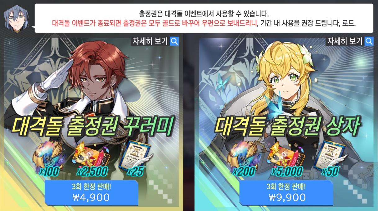 ※ [출정권]은 대격돌! 기사단 이벤트에서 사용할 수 있으며 이벤트가 종료되면 [출정권]은 모두 골드로 변경되며, 우편을 통해 지급됩니다.