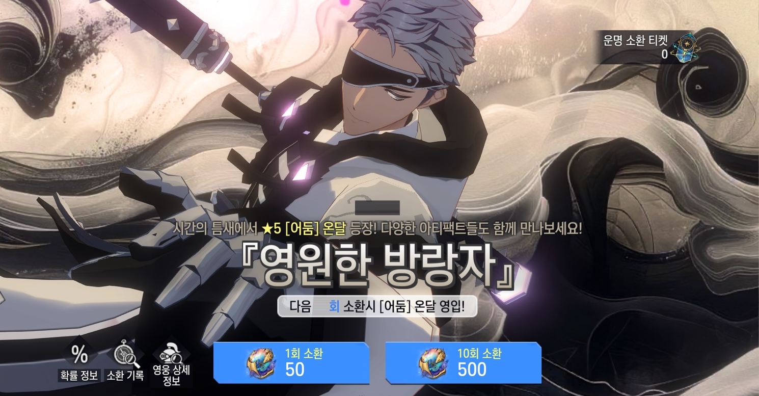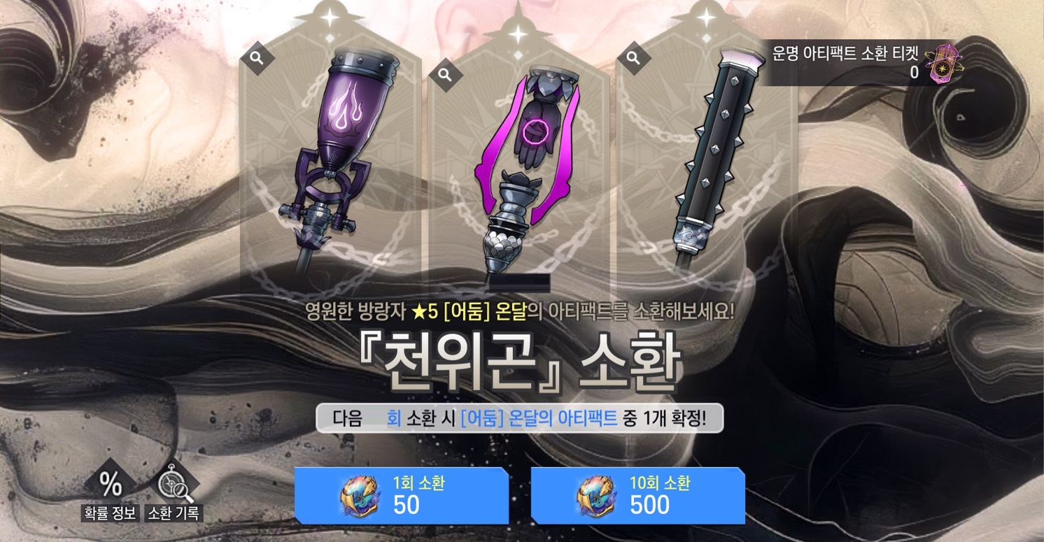 ※ 게임 내 소환 페이지에 있는 [확률 정보] 버튼을 통해 상세 확률 정보 및 소환으로 획득 가능한 아티팩트 목록을 확인할 수 있습니다.