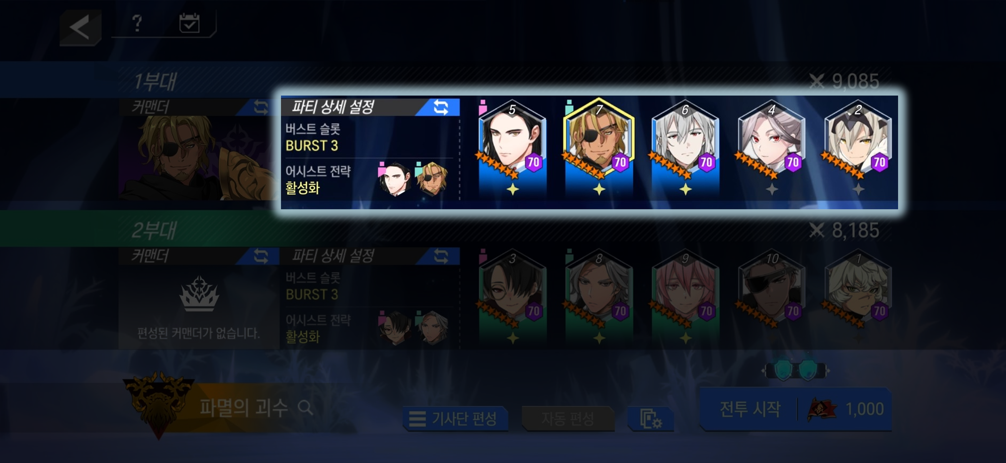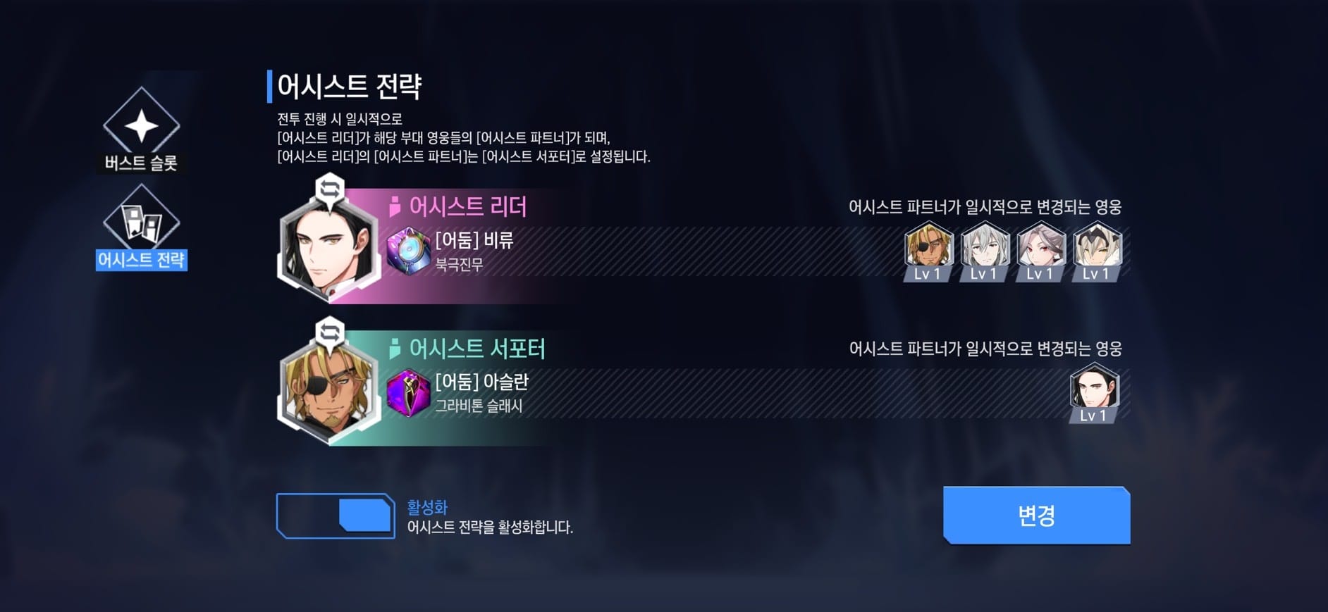 - [파티 상세 설정 페이지]>[어시스트 전략]을 통해 [어시스트 리더], [어시스트 서포터]를 확인할 수 있습니다.