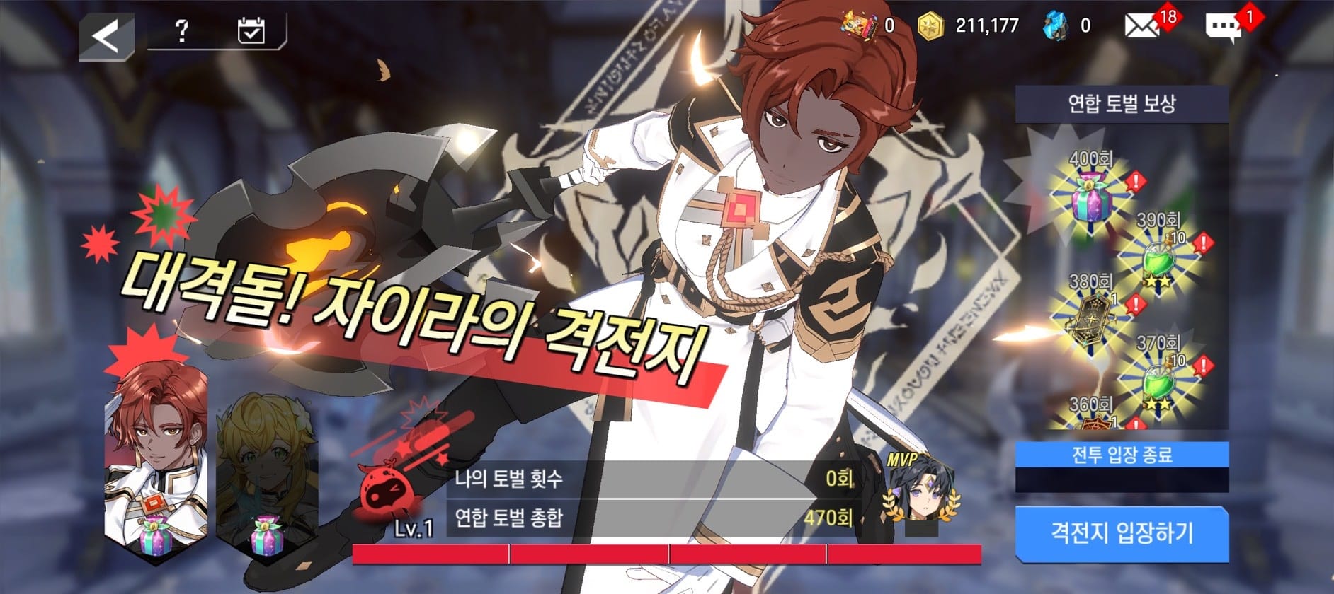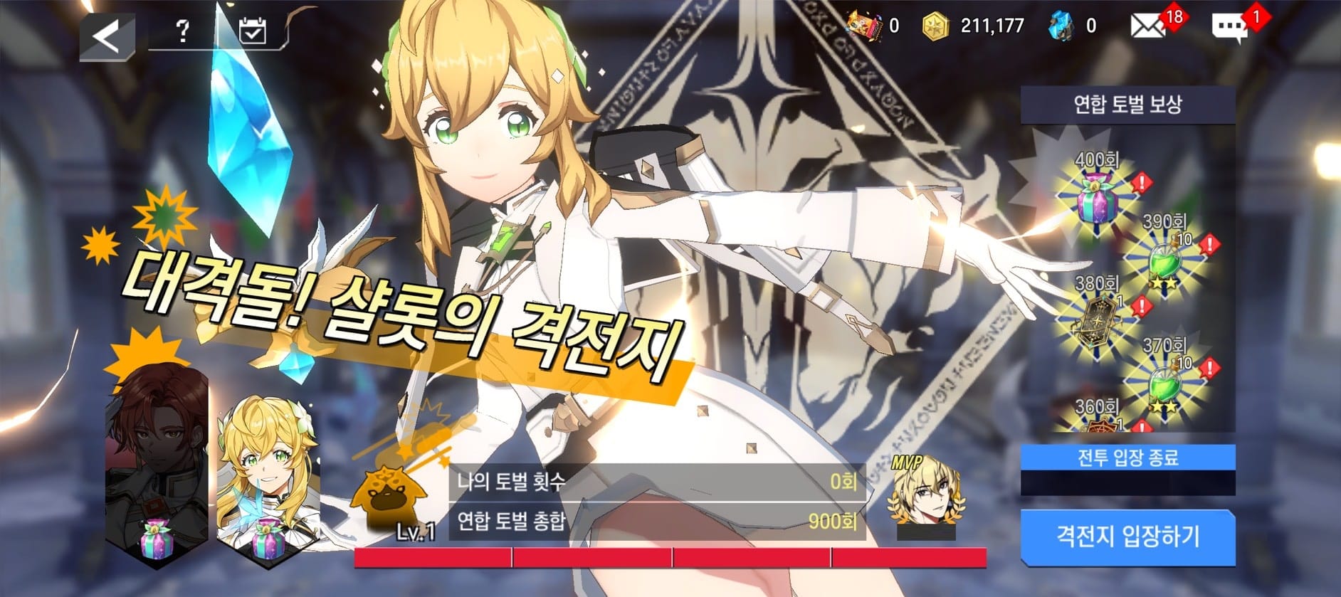 - [대격돌! 기사단] 격전지에 참여하기 위해서는 연합에 가입되어 있어야 합니다. 연합 가입 후, [출정권]을 소모하여 전투에 진입할 수 있습니다.