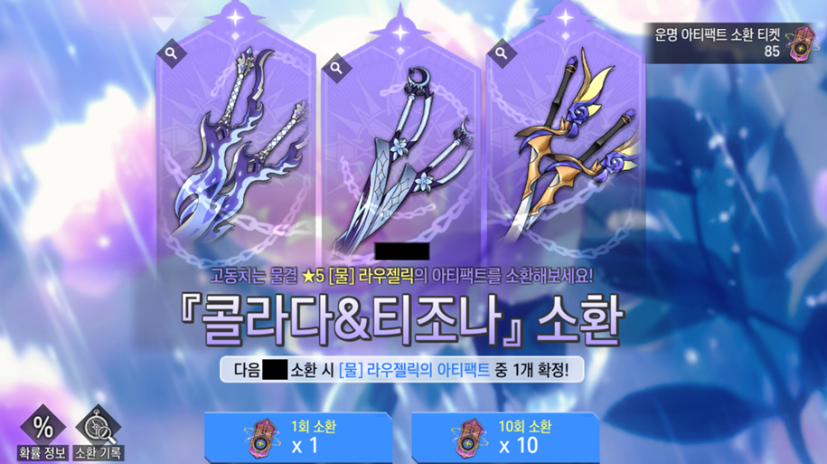 ※ 게임 내 소환 페이지에 있는 [확률 정보] 버튼을 통해 상세 확률 정보 및 소환으로 획득 가능한 아티팩트 목록을 확인할 수 있습니다.