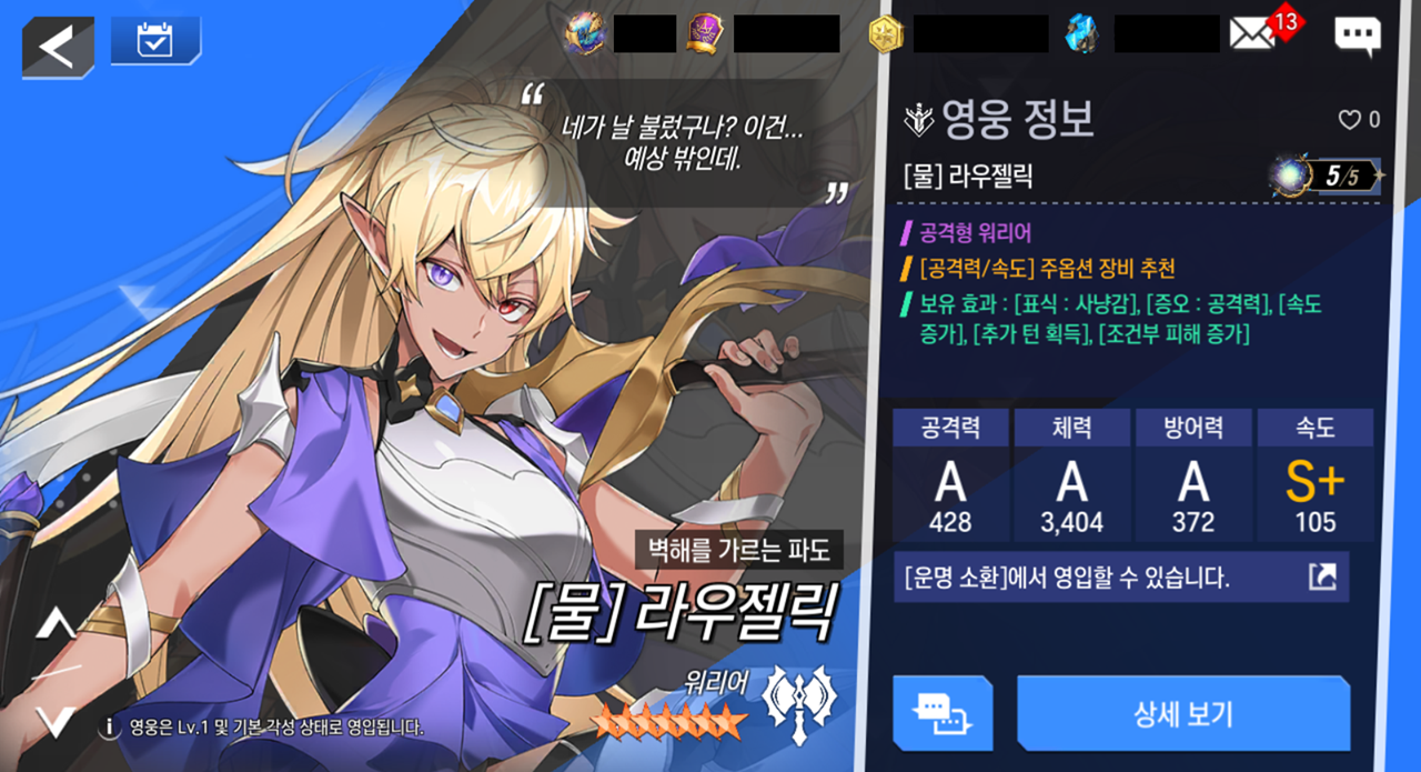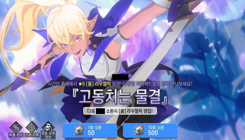 - [물] 라우젤릭은 [고동치는 물결] 소환으로 영입이 가능합니다.