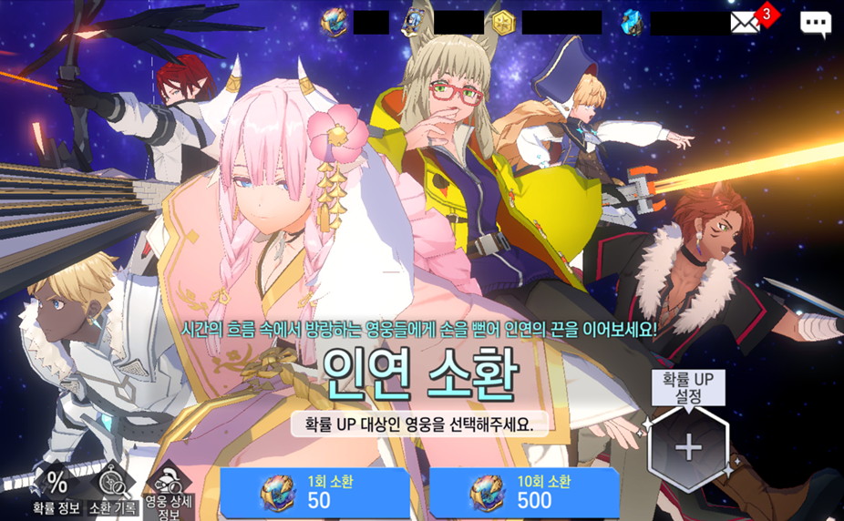 - 인연 소환은 영입을 원하는 영웅을 선택하여 소환을 시도할 수 있습니다.