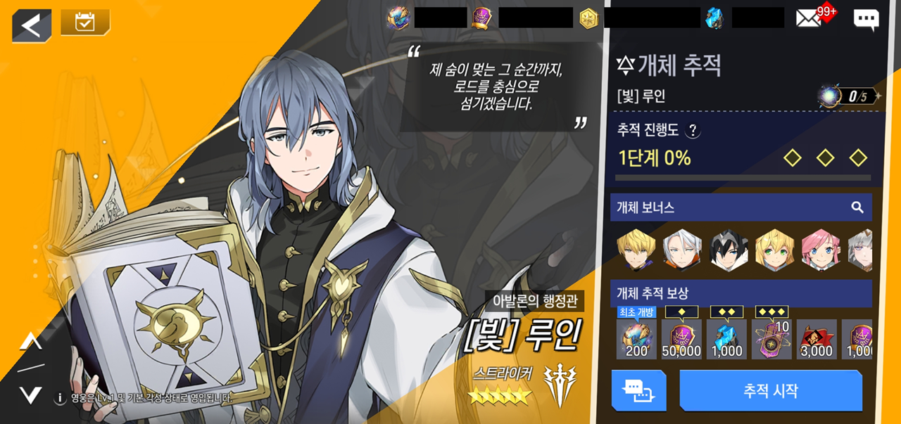 - 추적을 진행할 영웅 선택 시, 해당 영웅의 추적 진행도, 개체 보너스, 개체 추적 보상 등의 상세 정보를 확인할 수 있습니다.