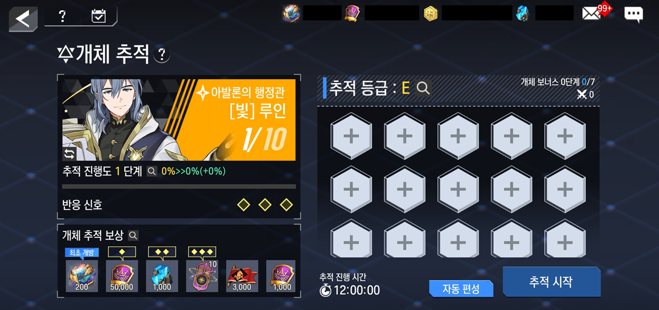 - 추적 대상 영웅의 개체 추적은 총 10단계로 이루어지며, 10단계 완료 시 해당 영웅의 추적 소환&추적 아티팩트 소환이 개방됩니다.