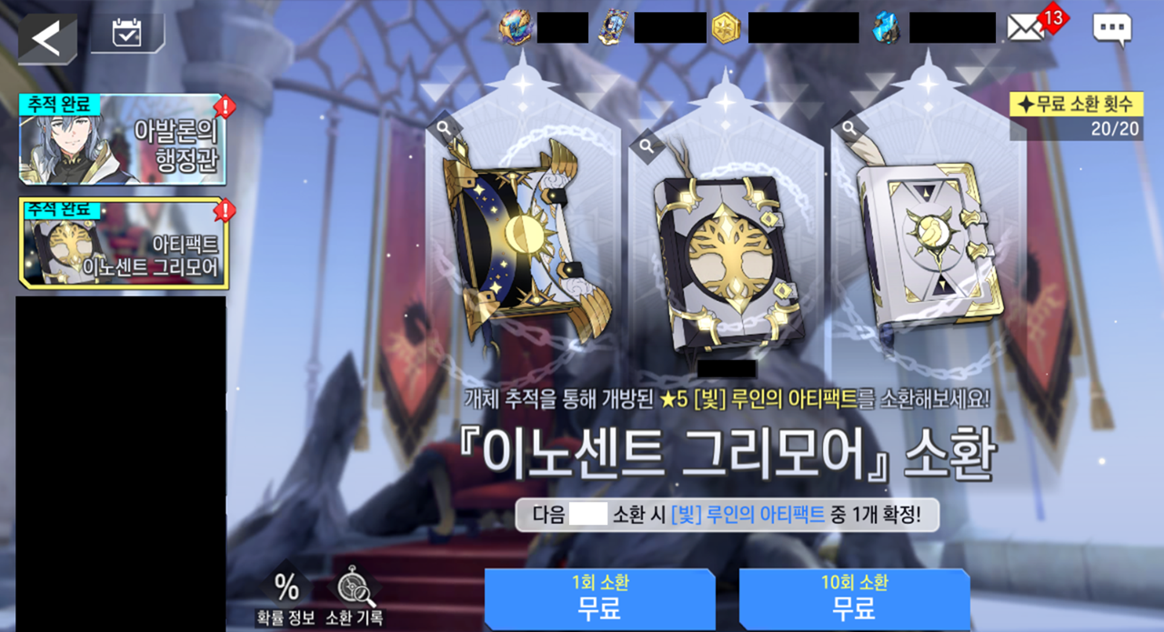 ※ 추적 소환, 추적 아티팩트 소환은 운명 소환, 운명 아티팩트 소환과 소환 횟수를 공유하지 않습니다.