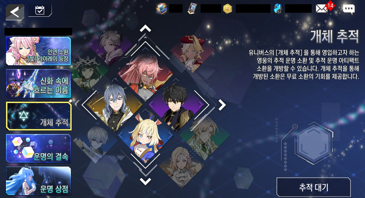 - [개체 추적]을 통해 영입하고자 하는 영웅의 추적 소환 및 추적 아티팩트 소환을 개방할 수 있습니다.