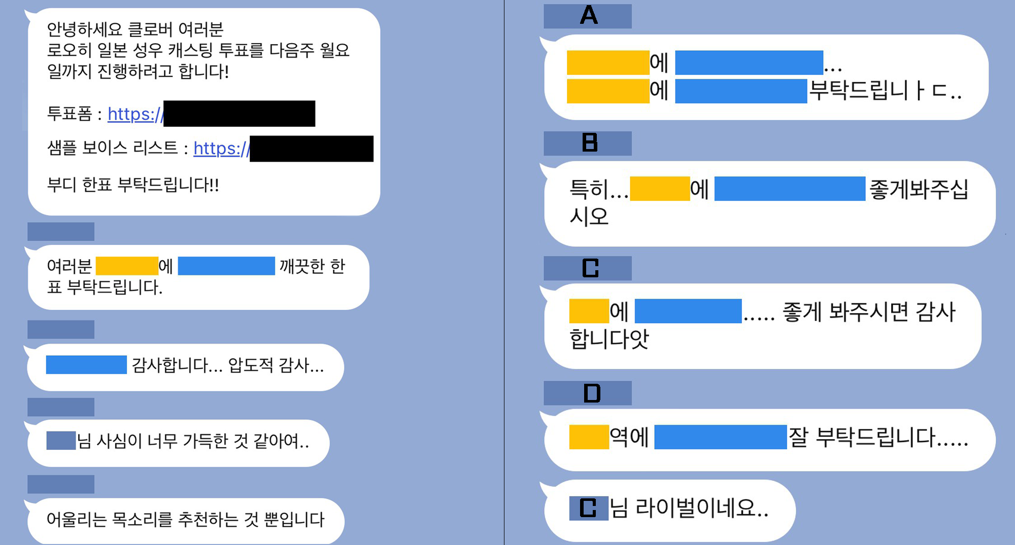 이후, 캐릭터마다 후보군을 받아 사내 투표를 진행하였습니다. 이 부분은 한국 성우 선정 과정도 동일했습니다. 리스트업을 해두고 어떤 캐릭터에 어떤 성우님이 어울리는지 투표를 했어요. 투표 시기가 되면 사내에서 프로듀스101처럼 이 성우분들을 꼭 뽑아달라는 성우 투표 유세가 펼쳐졌습니다.