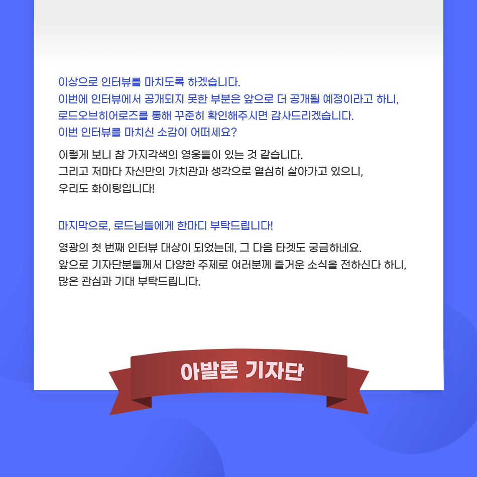 저희 아발론 기자단은 향후 2달간 활동에 책임감을 갖고, 로드분들의 목소리에 귀를 기울이며 활발한 소통 창구로서의 역할을 다할 수 있도록 노력하겠습니다.