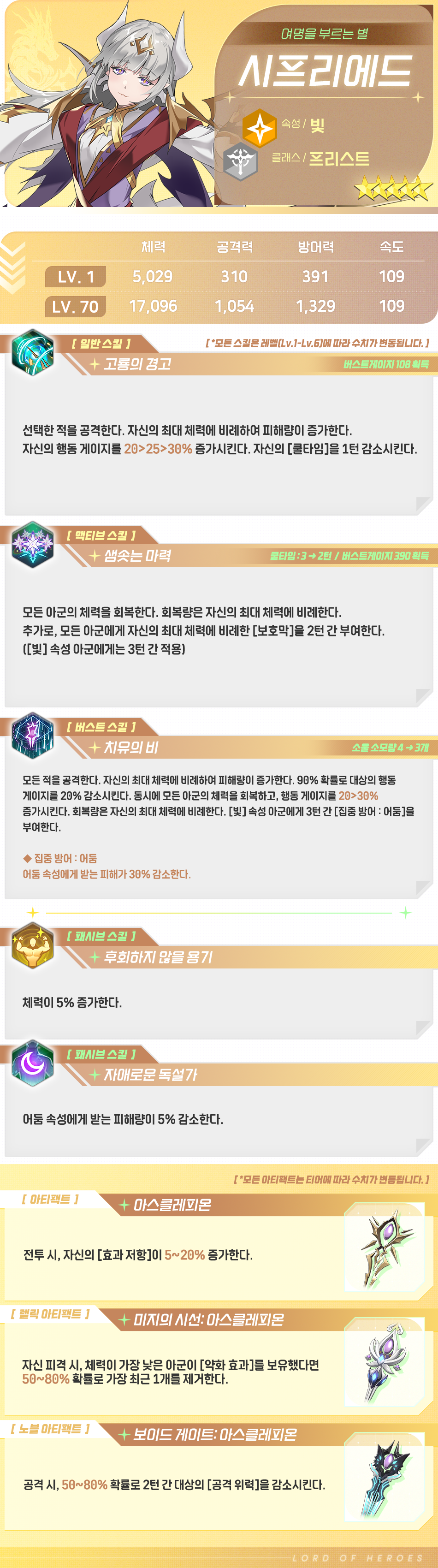 하지만 시프리에드 본인에게는 영웅이라는 이름도, 위대한 혈통도 그다지 중요치 않았습니다. 그저 방관을 거부할 정도로 세상이 아름다웠고, 그 속에서 살아나가는 평범한 존재들이 소중했을 뿐이니까요. 세상에 단 하나 존재하는 고룡과 인간의 혼혈, 그러나 그 어디에도 속하지 못한 자로서 오래도록 살아온 그녀에게는 함께 울고 함께 웃었던 이들과의 추억이 가장 소중한 보물입니다.