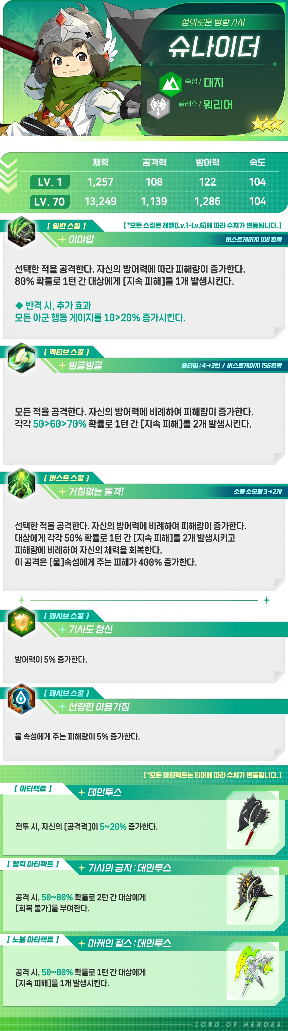 어린 시절부터 기사도를 동경했기 때문에 신념과 책임감이 남다른 편입니다. 순진하고 정의감이 넘치지만 눈치는 별로라서 타인의 말을 1차원적으로 이해하는 경우가 많고, 살짝 어리숙한 면도 있으나 밉지 않게 보이는 것은 슈나이더의 매력이겠죠.