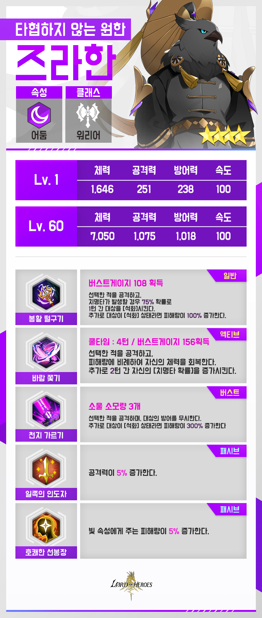 오로지 그만 살아남았다는 죄책감과, 당시에 아무것도 할 수 없었던 자괴감이 언제나 그의 마음을 옥죄고 있습니다. 몸에 새겨진 복수의 열망은 그의 깃털마저 까맣게 물들여 버렸고, 오로지 원한과 증오만을 양식 삼아 한 걸음 한 걸음 걸어나갑니다.