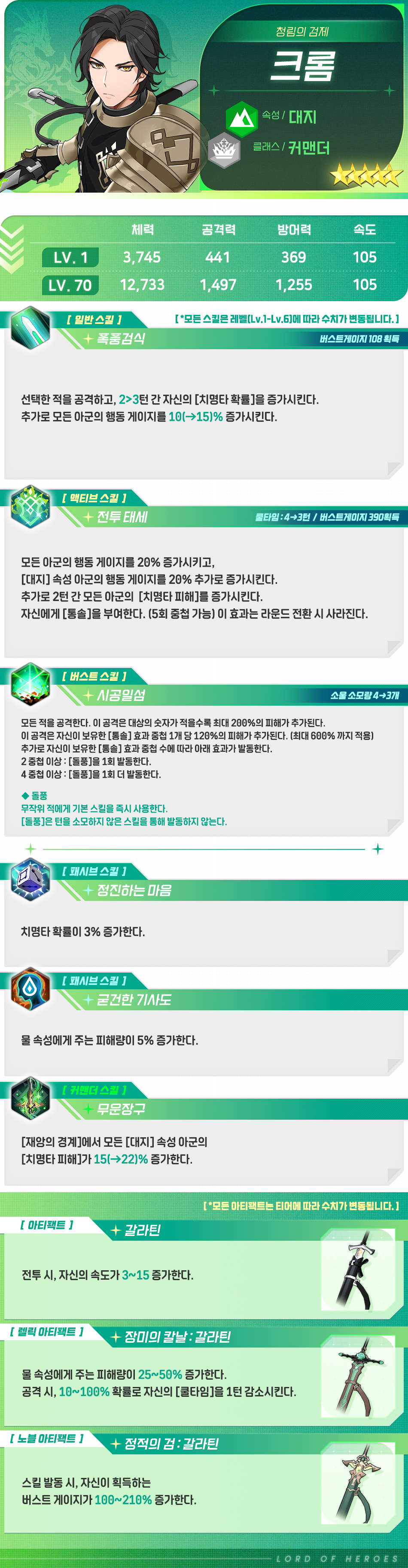 그러니 그의 이명을 들으면 모두 고개를 끄덕일 수밖에 없을 겁니다. 예술의 아름다움을 아는 '연회장의 꽃'. 끝까지 물러서지 않는 '무패의 기사단장'. 모든 이명에 그를 향한 애정이 담겨 있겠습니다만, 크롬을 가장 잘 설명하는 이름은 아무래도 '봄'일 겁니다. 크롬이 바라는 세상에는 잔인한 전쟁도, 혹독한 겨울도 오지 않을 테니까요.