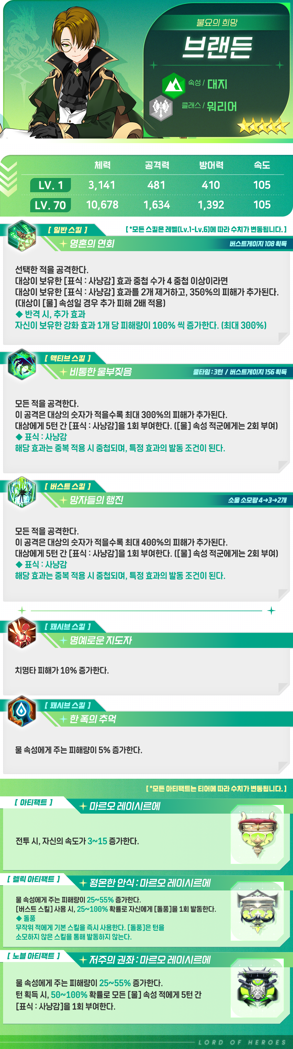 하지만 그날, 누군가의 희생과 함께 전쟁이 종식된 날. 브랜든은 다시 한번 모든 것을 떠나보내야만 했습니다. 검게 물든 하늘 아래 몇 번이고 이름을 불러도 되돌아오는 목숨은 없었죠. 모든 것을 놓아버리고 싶을 만큼 커다란 절망이었습니다. 그러나 브랜든은 놓을 수 없었고, 놓지 않기로 했습니다. 동료들이 이어준 내일을 제대로 살아내야 했으니까요.