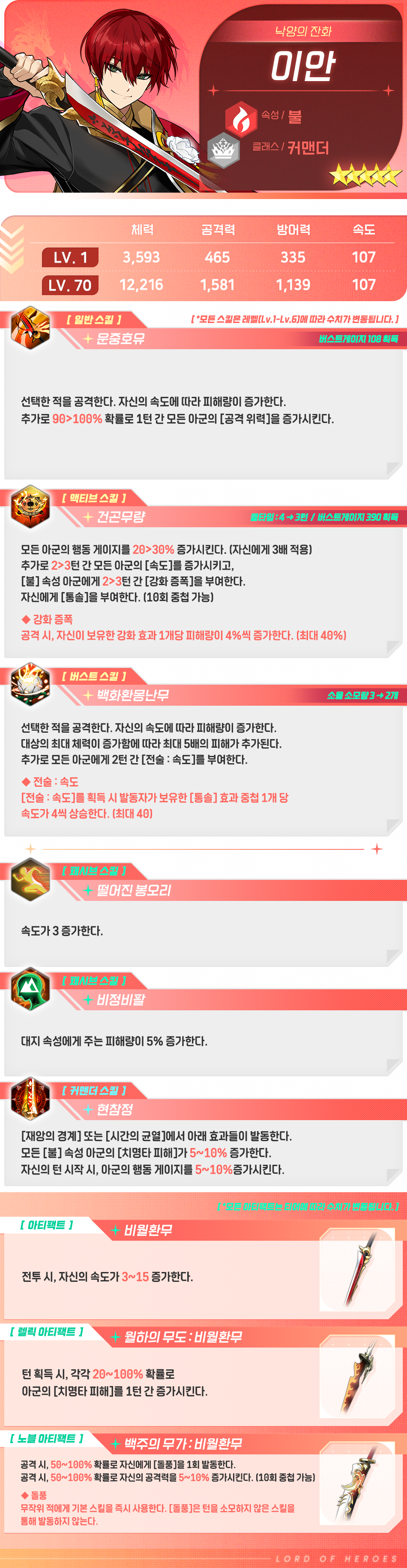 그러나 어려서부터 비정하기로는 남달랐던 이가 있습니다. 아이는 제 것이었던 부와 권력을 송두리째 잃어버린 날, 두 번 다시 그때로 돌아갈 수 없단 사실을 곧바로 깨달았죠. 이안은 남들보다 머리통 하나는 작던 나이에 열악하기로 유명한 토벌대에 자원했고, 궂은일을 마다하지 않은 덕에 금세 일취월장하게 됩니다. 부채를 잡기 위한 손은 검에 익숙해져갔고, 아름다운 발디딤으로 길러낸 균형감각은 어느 전장에서든 그를 살아남게 했죠. 최연소로 부대장 자리를 꿰찼을 때는 곧 차기 중앙군의 수장이 되리란 소문이 무성했습니다. 하지만 천자는 어째선지 그를 전승자 자리에만 올렸죠. 이로부터 수많은 풍문이 나돌았지만, 이안은 묵묵히 제자리를 지키고 출정할 뿐이었습니다.