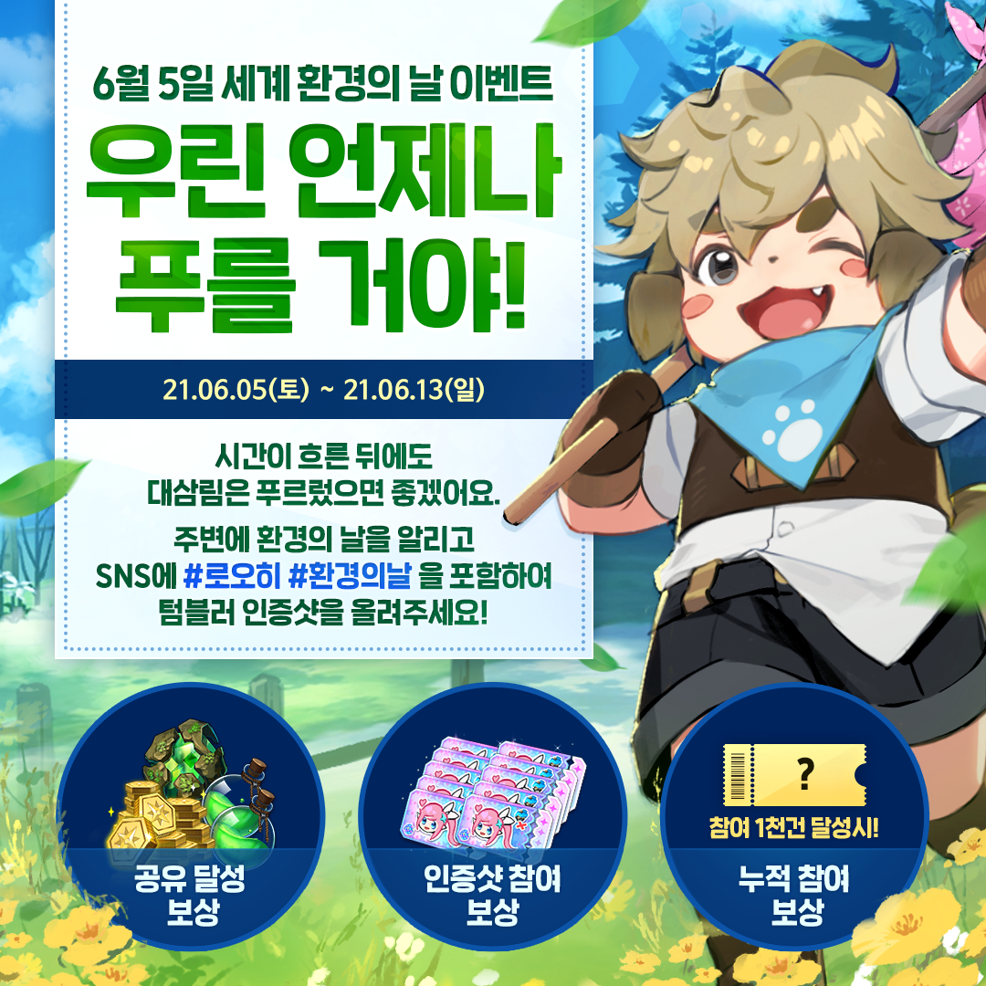✌ 자신의 SNS에 #로오히 #환경의날 해시태그를 포함하여 업로드 한 뒤 아래 링크에 응모하기!