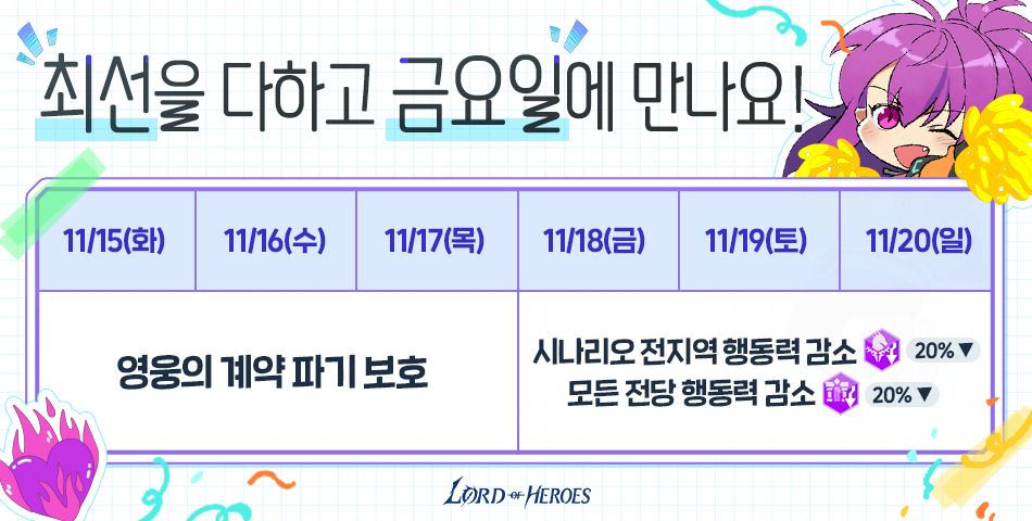 - 11/15(화) ~ 11/17(목)에는 게임에 접속하지 않아도 영웅의 계약이 파기되지 않습니다.