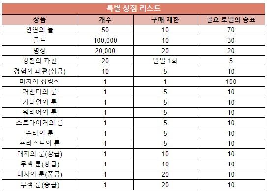 - ‘[피요] 토벌의 증표’을 사용하여 ‘특별 상점’에서 다양한 아이템으로 교환할 수 있습니다.
