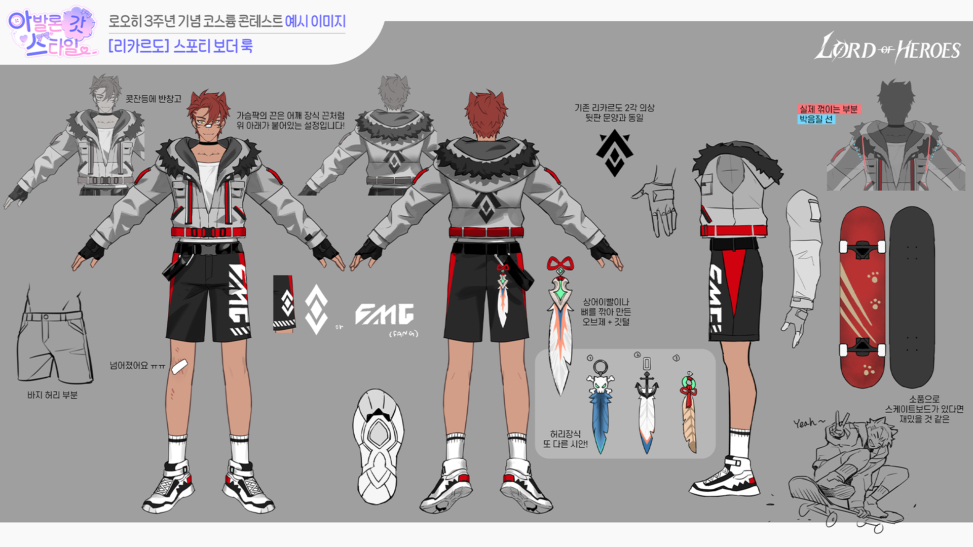 - 수상작은 로드 오브 히어로즈의 정식 인게임 코스튬으로 구현 및 출시됩니다. 실제 제작에는 다소 시간이 소요될 예정이며, 발매 일정은 내부 사정에 의해 변경될 수 있습니다. 최대한 빠르게 만나보실 수 있도록 노력하겠습니다.