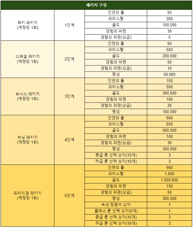 ※ 1~4단계까지 상품의 구매 횟수는 1회이며, 5단계 상품만 10회 구매가 가능합니다.