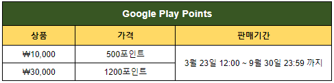 2. Google Play Points 상품 추가- 3/23(목) 12:00 ~ 9/30(토) 23:59까지 Google Play Points 상품이 추가됩니다.