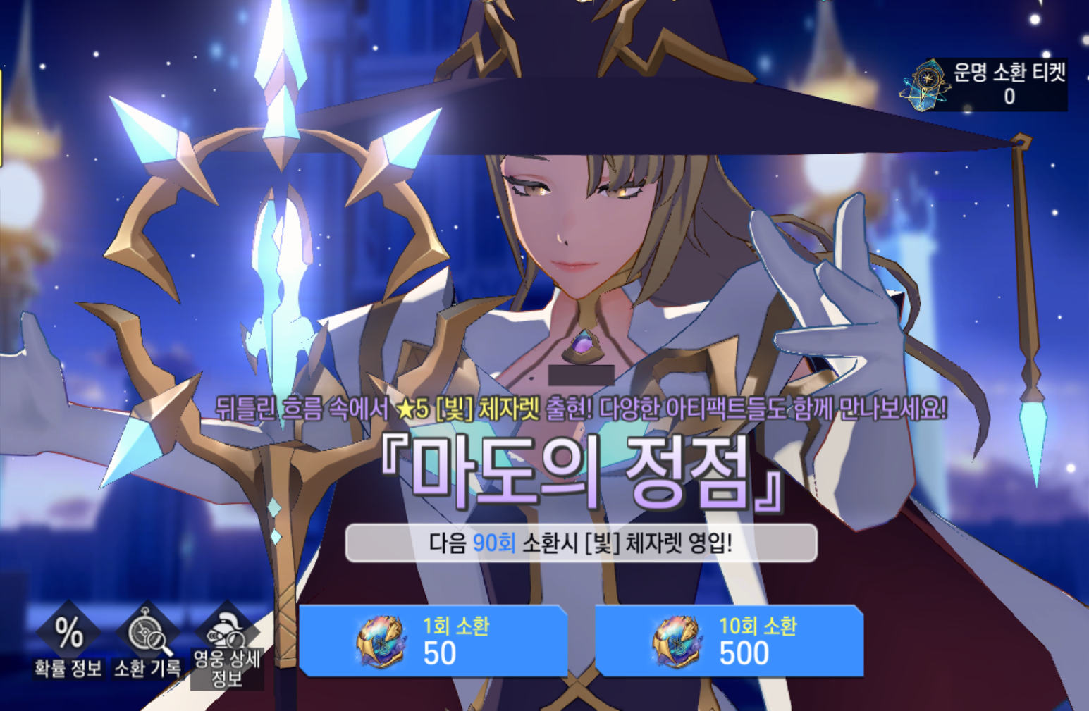 ※ ‘마도의 정점’에서 89회까지 소환시에도 ★5 [빛] 체자렛이 등장하지 않을 경우, 90번째 소환에서 ★5 [빛] 체자렛을 100% 확률로 소환합니다.
